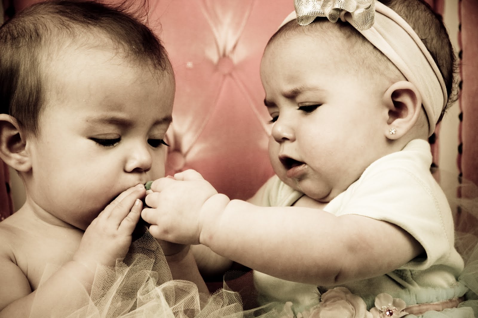 This pic is of Kimber and her cousin Zoe-Faye who is three months older than her. They will be best of friends someday! Zoe-Faye is Helen's daugther (the photographer). They are already learning to share. :)So pretty.......I love when I can see her little mind at work.